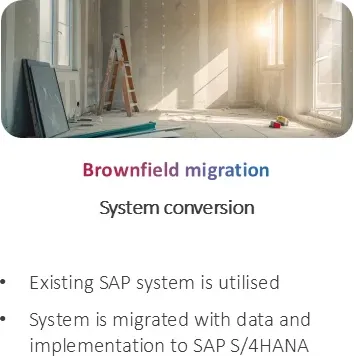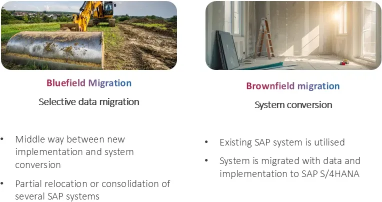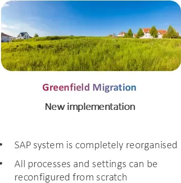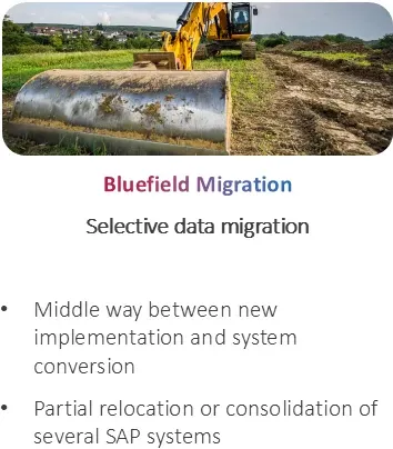 When choosing a migration tactic, you need to determine how you’re going to process your data based on whether you’ll be completely redesigning from scratch with all new processes and settings (a “Greenfield” migration) or simply moving your current data and systems into S/4HANA (a “Brownfield” migration). You can also convert using a hybrid tactic, keeping some parts of your old system while creating some new systems from scratch (a “Bluefield” migration).
