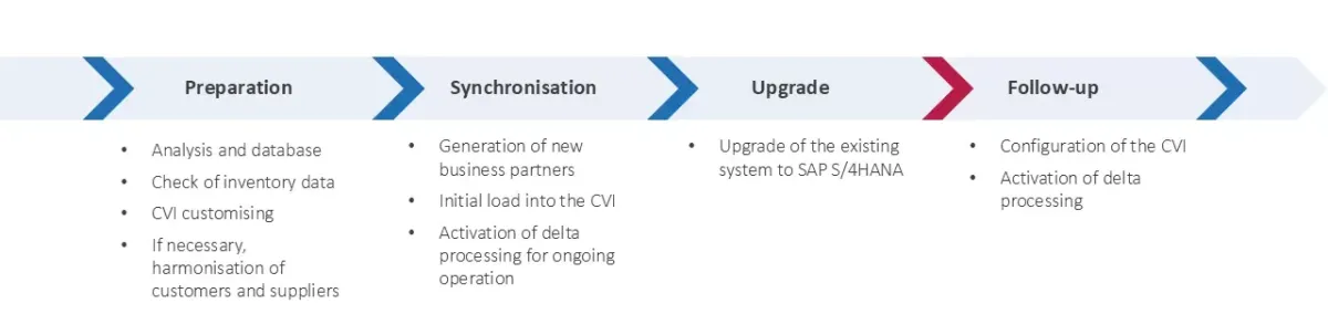 Once you’ve decided on a migration strategy, you can begin the actual execution of the process. There are 4 basic steps required for upgrading, with preparation being one of the most important. Preparation of your current data is a critical step in upgrading to S/4HANA. All the data in your system needs to be cleaned, corrected, and synchronized to guarantee a successful upgrade.